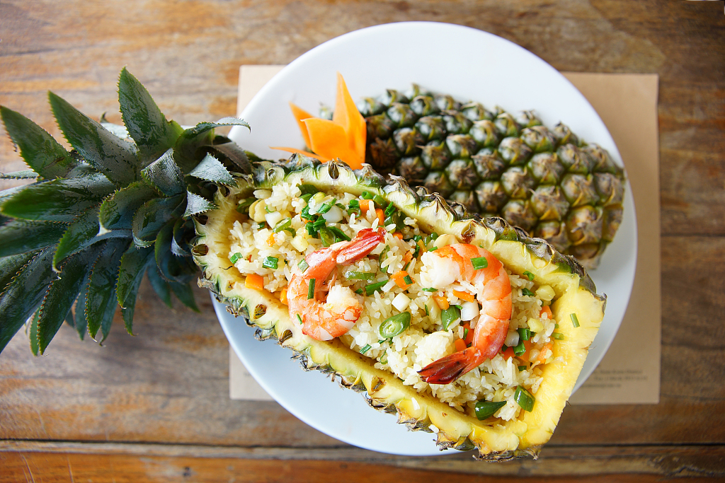 人们喜欢泰式菠萝炒饭的理由,大概不仅仅是因为以泰国香米和搭配菠萝及什锦蔬菜一起炒出了酸酸甜甜的口感,将金黄诱人的炒饭直接装盘在菠萝盖中,更是吸引吃货的眼球。如果再配上香脆的腰果,每吃一口都是享受。