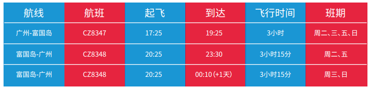 南航已开通广州-富国岛航线,具体航班信息如下: