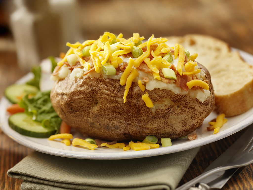 Jacket Potato即“皮夹克土豆”,因为这种土豆是带皮烤熟的,看上去就像是人穿了漂亮的夹克衫一样。烤好的土豆颜色鲜黄,香气四溢,十分诱人。食用时,把熟的土豆一切两半,在里面如同夹汉堡一样夹入各种蔬菜沙拉、干酪、沙丁鱼、鸡肉、黄豆等配料,味道十分鲜美。
