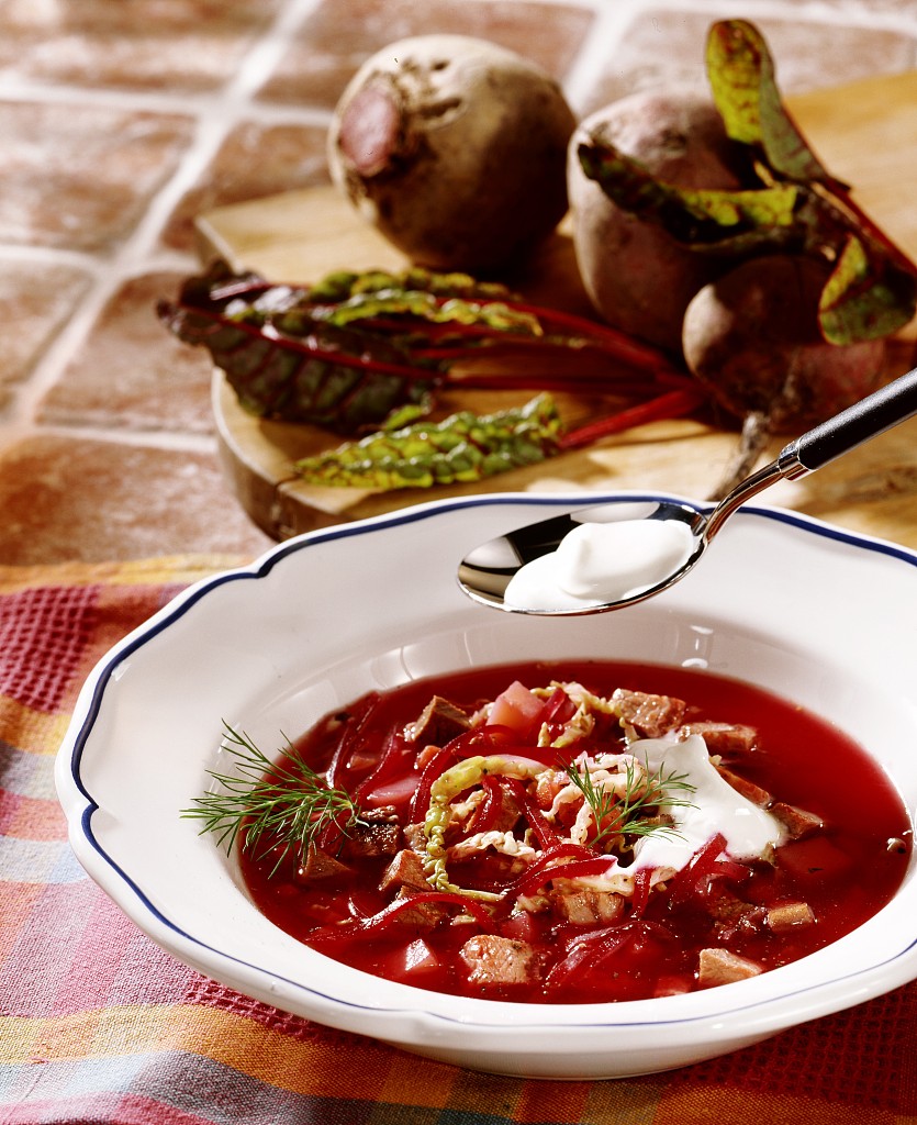 红菜汤是俄国最具代表性的传统汤品,以红菜为汤底,除了会加进包心菜、西红柿、马铃薯、芹菜和洋葱等蔬菜之外,还要加入牛腩或用清牛肉汤熬煮。俄罗斯人会在煮好的红菜汤中淋上酸奶油再享用,这样更能尝出汤的美味精髓。