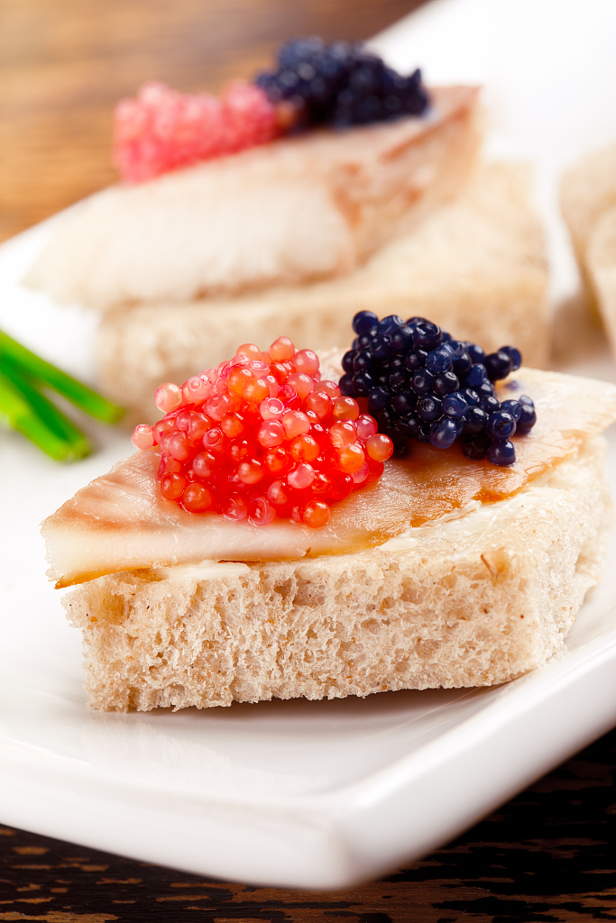 俄罗斯产的鱼子酱品质堪称是欧洲人最爱的美食。鱼子酱有灰(明太鱼)、红(鲑鱼)和黑(鲟鱼)三种,其中以黑色鱼子酱最为珍贵,对俄罗斯人来说,吃一片抹上黑鱼子酱和黄油的面包可谓是是难得的享受。