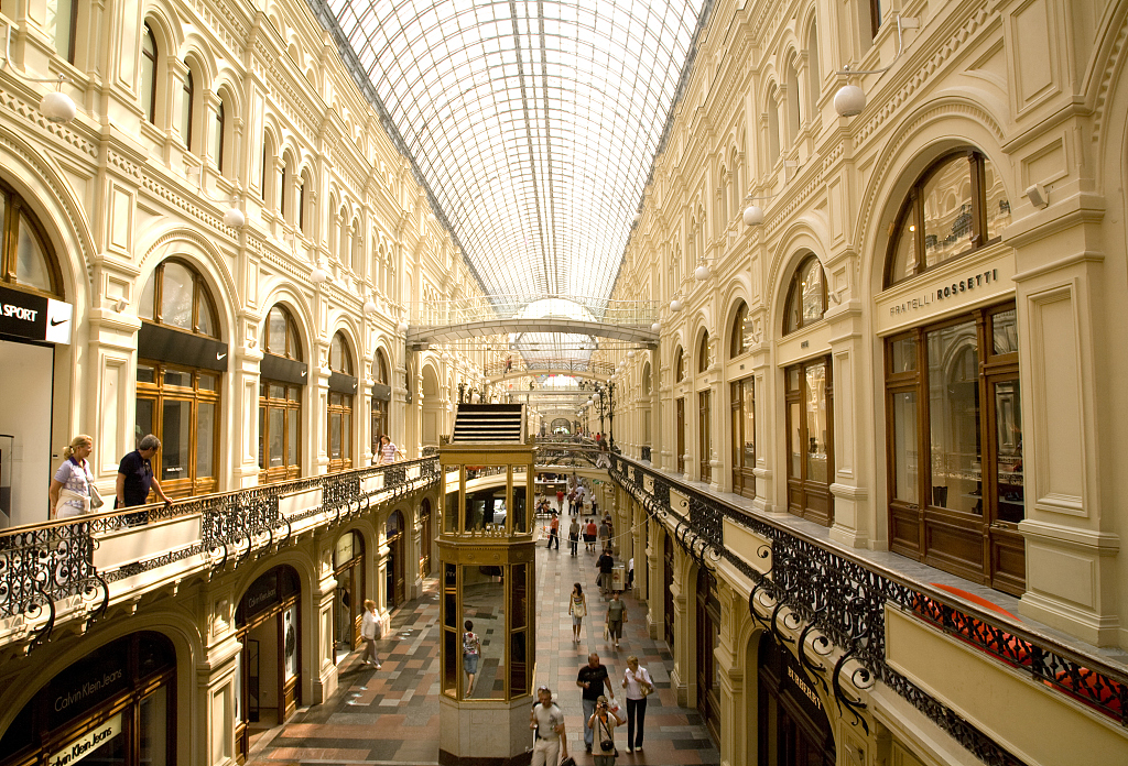 古姆国立百货商店是莫斯科最大的百货商场,也是欧洲最大的百货商店之一。这里之前主要卖食品、服装等日常用品,现在有很多名牌专卖店、纪念品商店,商场一层中间的喷水池也是莫斯科人最喜欢的约会场所。