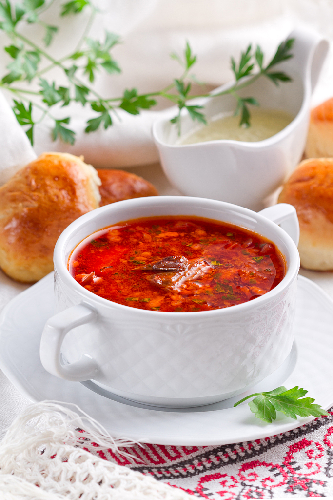 红菜汤是俄国最具代表性的传统汤品,以红菜为汤底,除了会加进包心菜、西红柿、马铃薯、芹菜和洋葱等蔬菜之外,还要加入牛腩或用清牛肉汤熬煮。俄罗斯人会在煮好的红菜汤中淋上酸奶油再享用,这样更能尝出汤的美味精髓。