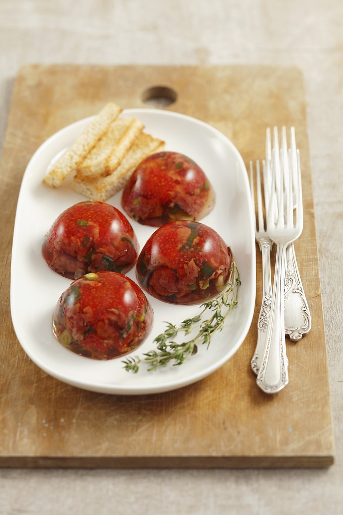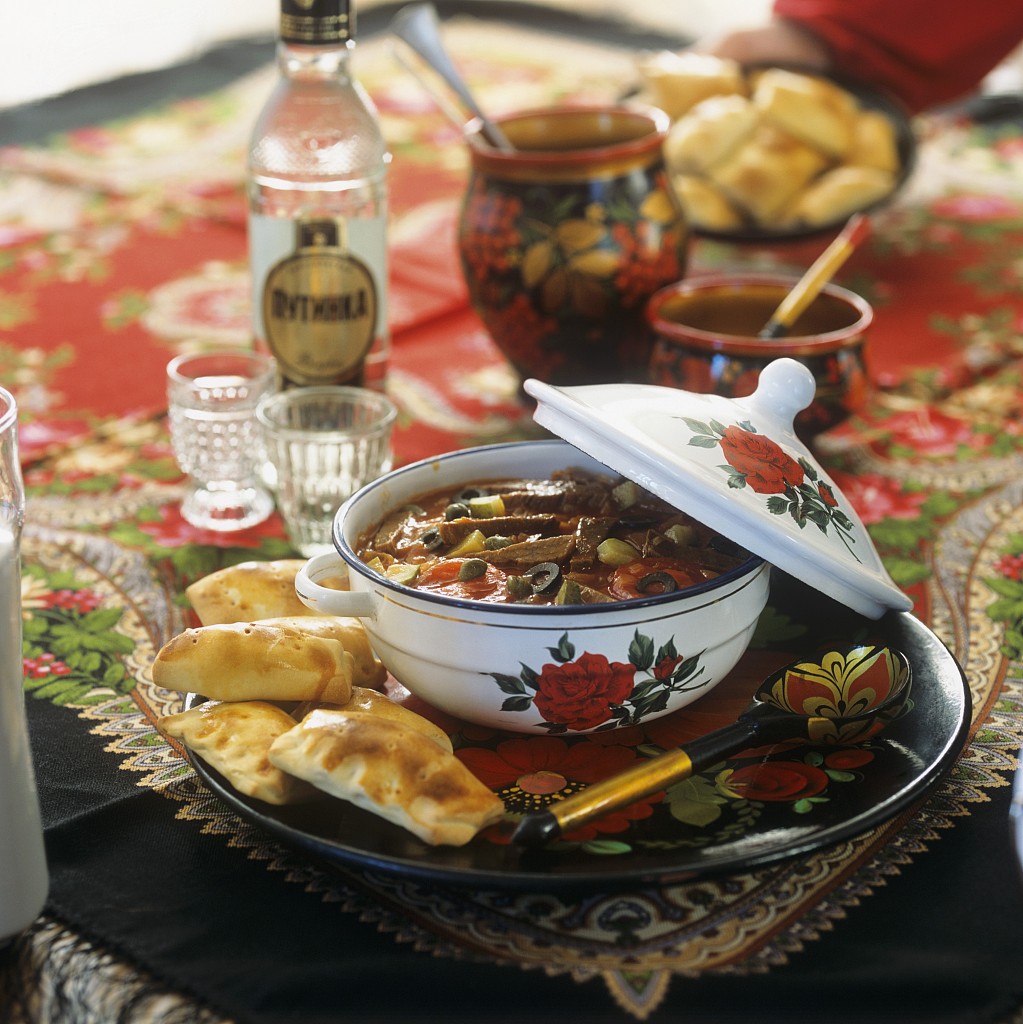俄式肉冻是俄罗斯人举办大小宴会时不可或缺的重要菜肴。传统的俄式肉冻做法是将各种肉炖在一起后,把煮化的肉皮倒进去,放在零下15-20度的室外结冻。每年敲响新年钟声之前,各家各户会将装满肉冻的碗从窗外拿进来,摆到餐桌中央,寓意着年夜饭的开始。