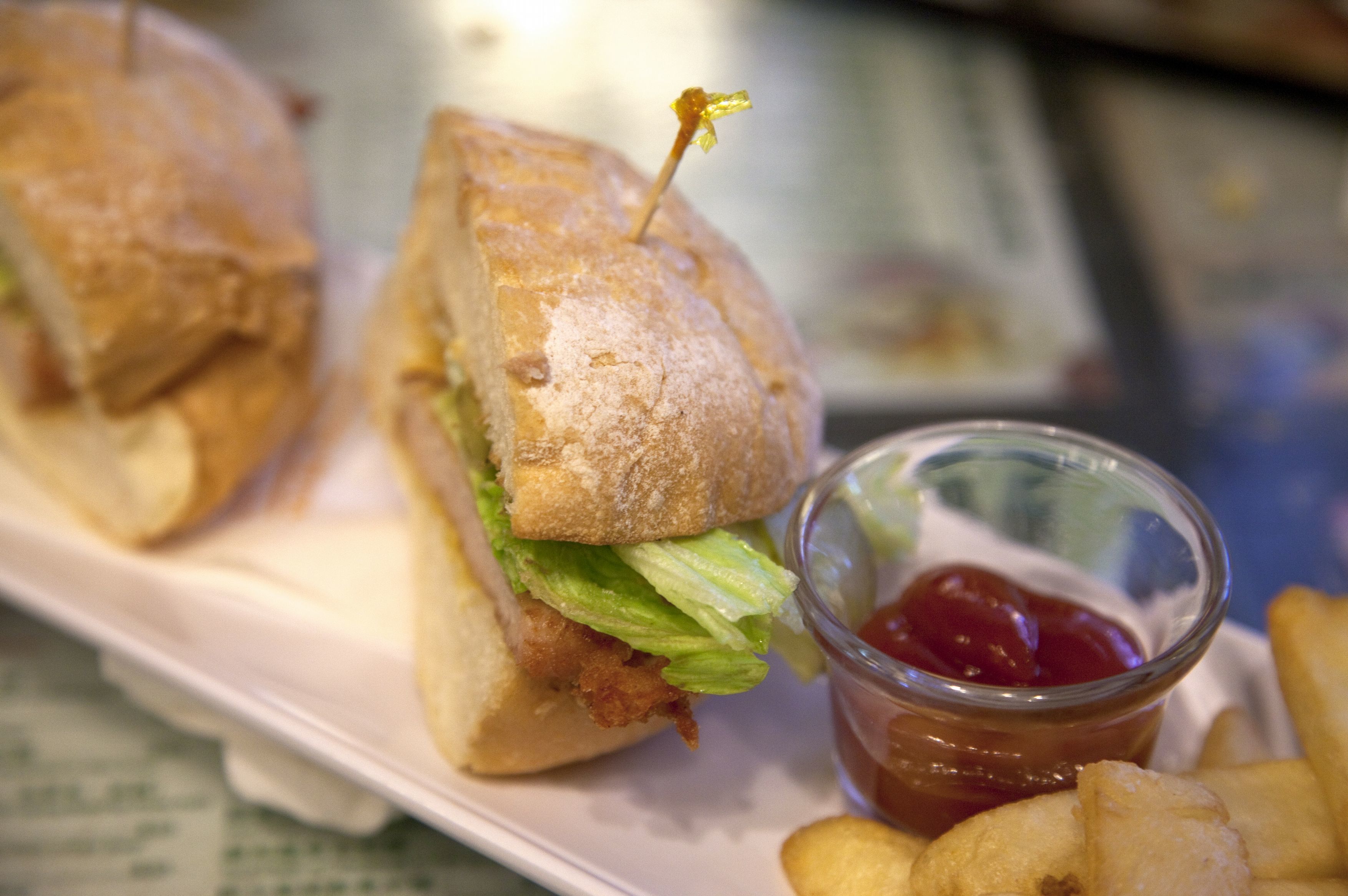 猪扒包其实就是汉堡包,面包里夹上炸好的猪排、西红柿片和生菜,配上香甜的酱汁,一口下去,猪排和蔬菜在舌尖交融,十分满足。