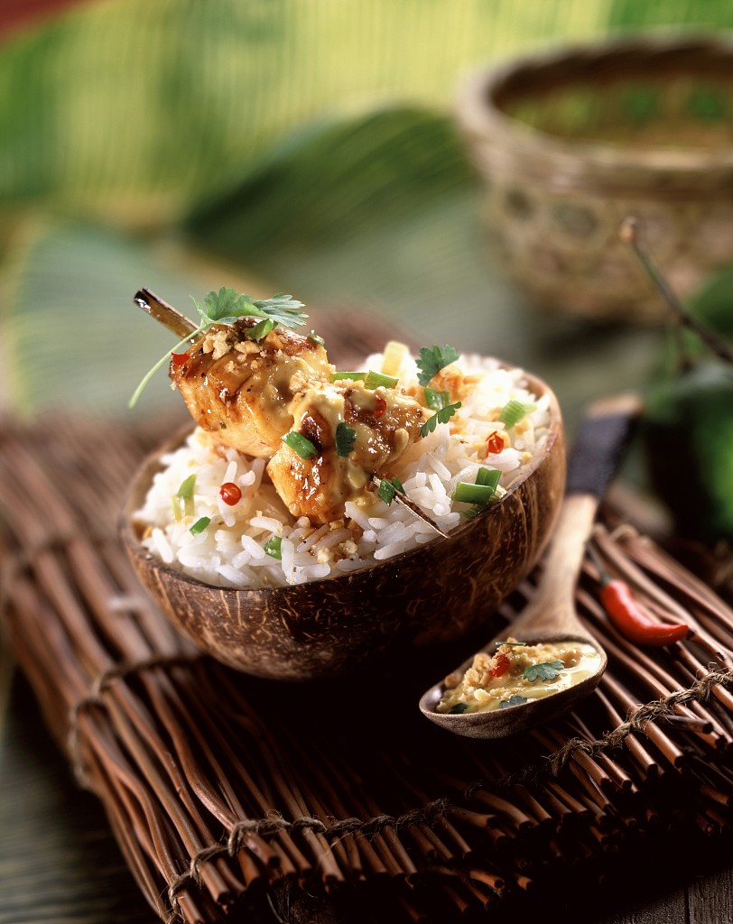 椰子饭以海南椰子肉为底,用海南优质糯米、椰肉和椰汁一起放锅蒸熟后,浓浓的椰香飘至十里,咬上一口甜香可口,十分诱人。