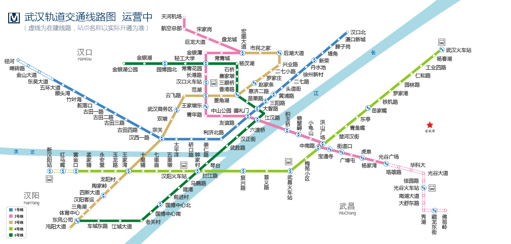 目前,武汉市共开通五条地铁线,分别为1、2、3、4、6号线,覆盖绝大部分景点,出行便捷,另有7、8、11号线正在建设中。