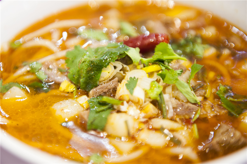 荞面饸饹是陕北地区传统的特色小吃,它与兰州拉面、山西刀削面并成为“北方面食三绝”。在延安当地街边随处可见饸饹店。荞面饸饹是以荞面为原料,色泽黑亮,韧劲爽口。汤也有荤和素两种,但最常见的搭配就是陕北羊汤,味道鲜美可口,越嚼越香。