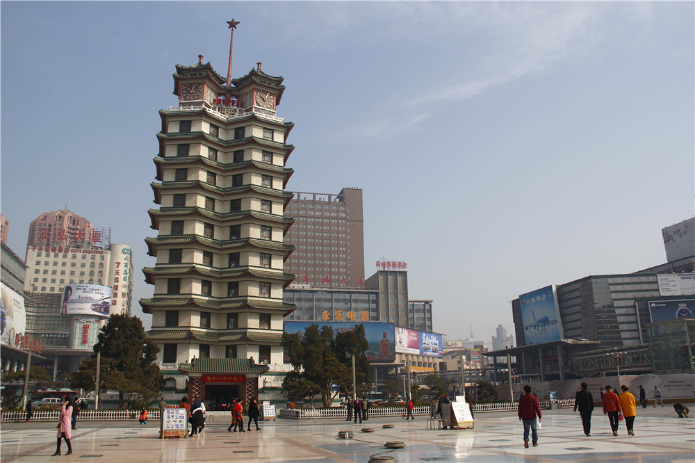 二七广场位于市中心繁华地段,周边布满着琳琅的店铺。广场中心的二七纪念塔是郑州的标志性建筑之一,纪念京汉铁路工人大罢工事件(1923年2月7日)而建立,一共十四层,高63米。塔顶有钟楼,一到整点就报时演奏《东方红》,歌声悦耳动听。尤其到了晚上看二七纪念塔更是美丽,彩色的灯光照耀下更加耀眼。
