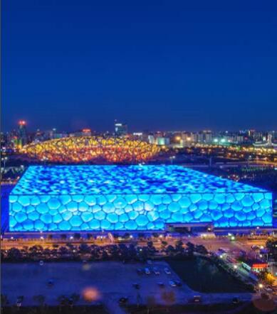 水立方在鸟巢的西面,是2008年北京奥运会期间游泳、花样跳水等比赛的比赛场馆,整体结构根据人体细胞的排列和肥皂泡的灵感设计而成。
