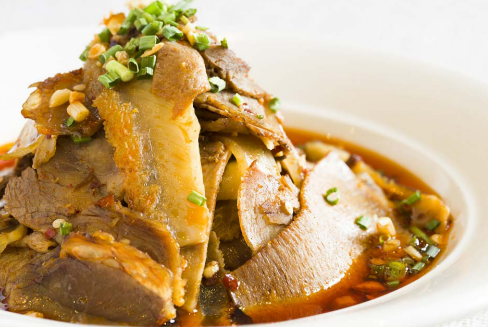 夫妻肺片是四川经典麻辣风味凉菜,将牛肉、牛百叶等切为薄片,拌以花椒、辣椒、碎花生米、芫荽等调料,油量十足,吃起来又麻又辣,十分开胃。
