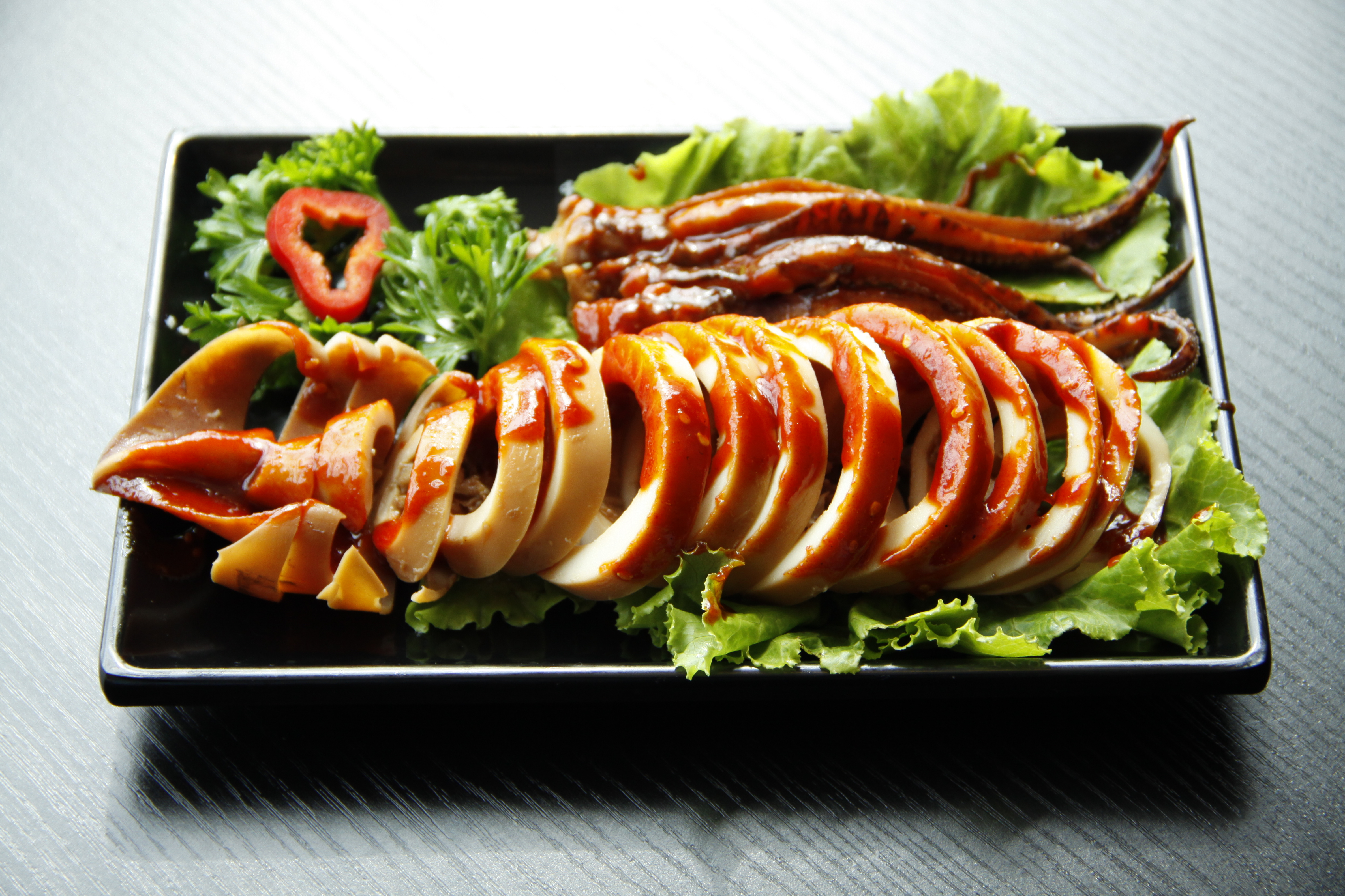 虽然大街上很多大连铁板烤鱿鱼,这种铁板烤鱿鱼烤完后再刷上辣椒酱等调料,吃起来也很过瘾。但是大连还有一种烤鱿鱼,是用一整条鱿鱼烤制而成,可以现烤现吃,也可以真空包装好带走,回家慢慢吃。烤制方式是双面铁板烤,类似于烤鱼片。但是这可是用新鲜鱿鱼烤制,不含防腐剂等添加剂,老人小孩可以放心食用。只不过这种新鲜的烤鱿鱼不能保存很长时间,做好后3天内吃完。