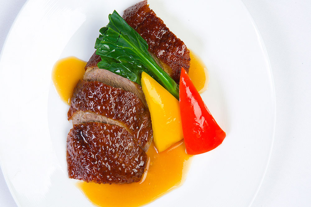 广东烧鹅——粤菜名菜。选用幼鹅腌制入味,稍汆水晾干入炉烤制而成。