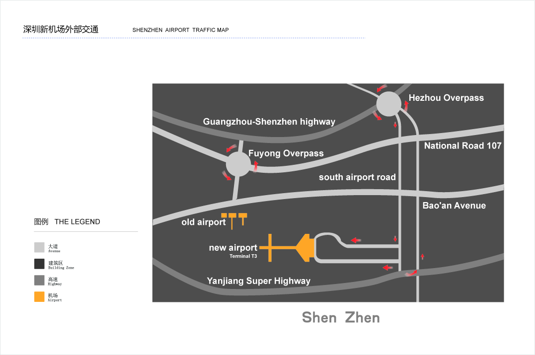 Shenzhen Bao’an International Airport lies in the northwest of urban district, about 32 km from the city. There are Guangzhou-Shenzhen highway, National Road 107, and Bao’an Avenue to the east side of the airport, Yanjiang Super Highway to the west, south airport road and Jihe Expressway to the south, and Fuhai Avenue to the north. Among them, the south Airport road is the only way to the entry or exit of Airport Terminal T3.