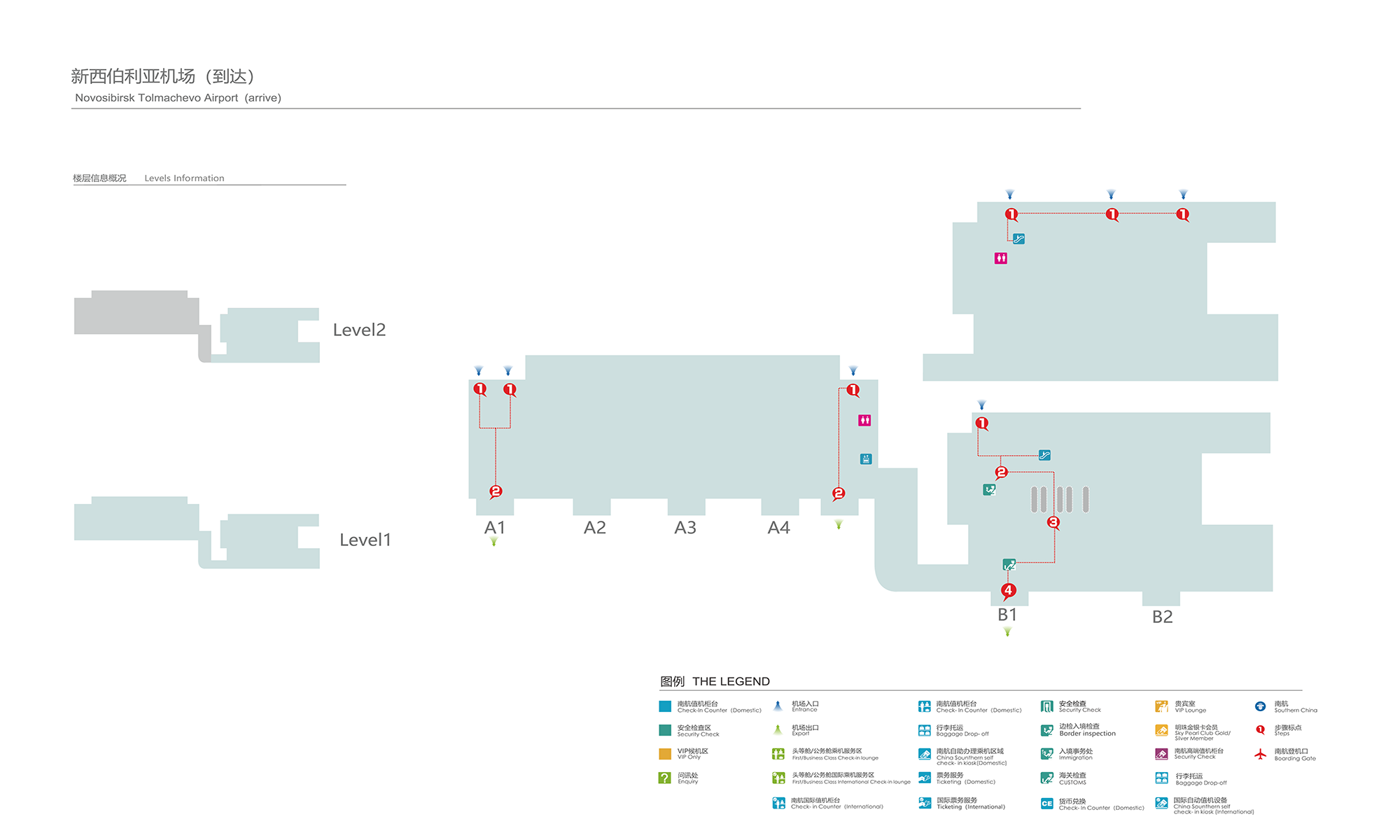 一層:出發層、到達層。出發旅客辦理值機手續;到達旅客辦理邊防、行李提取、海關、檢驗檢疫手續。在出發區域有機場餐飲休息區。
