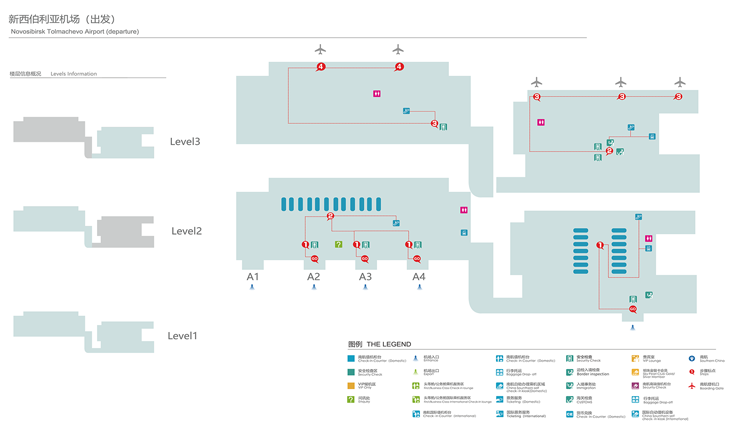 二層:出發層。出發旅客在該層辦理海關檢查、邊防、安檢手續,候機廳。有機場餐飲休息區,免稅店。