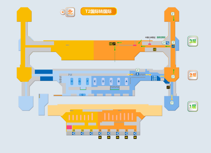 一层:国内、国际到达层。设有国内、国际旅客行李提取大厅,国际到达海关检查,国内-国际交叉中转区,国内远机位出发候机区,机场要客休息室,有连接桥通往交通中心。