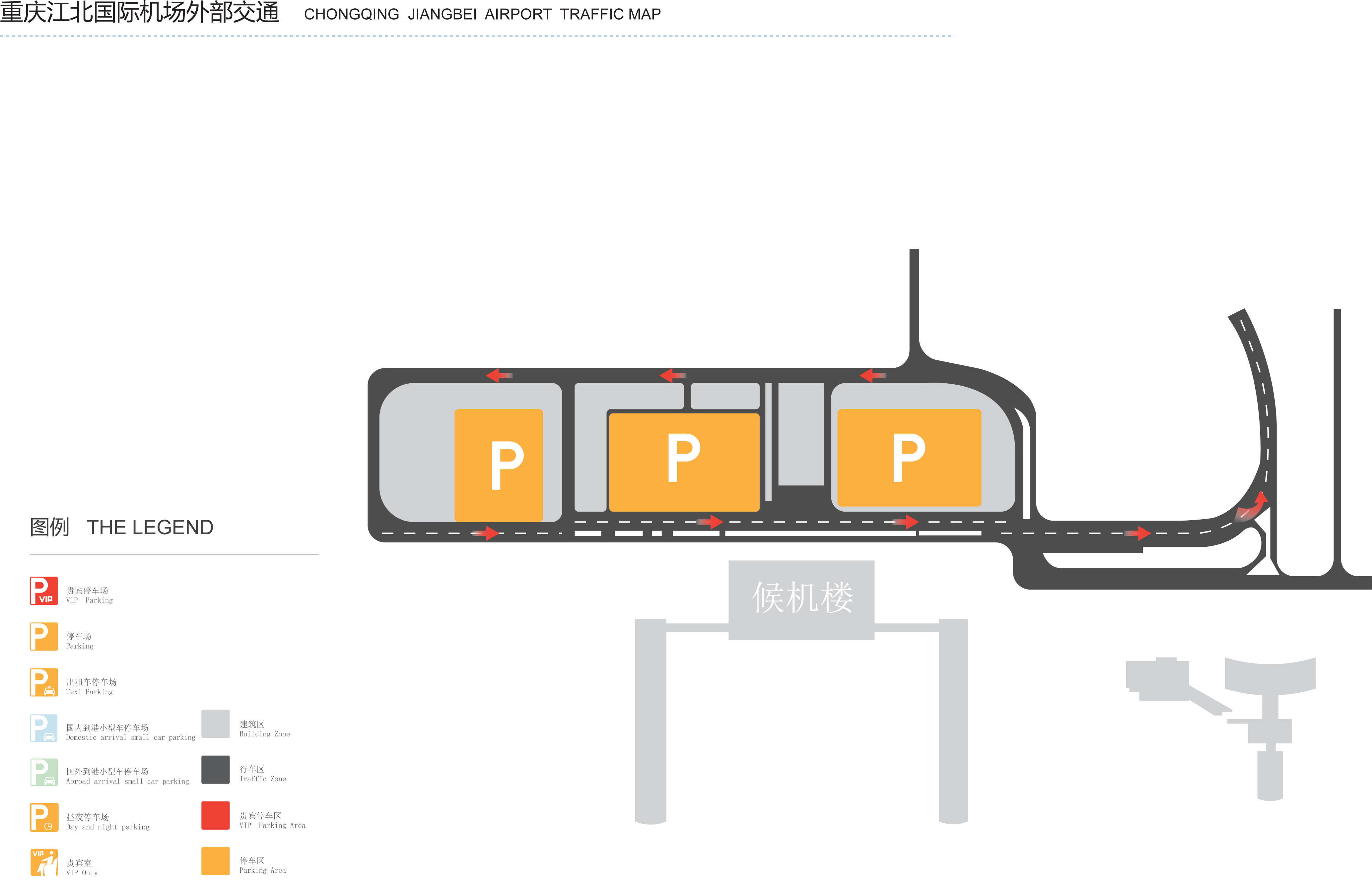 重庆江北国际机场T3航站楼停车场位于综合交通枢纽内,共设停车位约5000个。