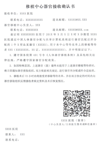 2.准备《移植中心器官接收确认书》原件和两份副本,乘机当日向始发站南航值机部门和机场安检部门提供,注明所运输器官的合法来源、用途、联系人姓名及联系电话等。