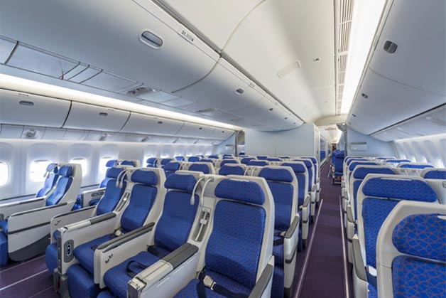 客舱设有4个半包厢式头等舱座位、34个全平躺公务舱座位、44个侧卧滑躺式明珠经济舱座位和227个舒适经济舱座位。