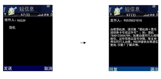 手机用户发送自然语言办理短信值机,即通过编辑短信内容“值机”、 “ZJ”、“登机牌”等关键文字发送到95539,旅客根据系统回复提示办理值机。