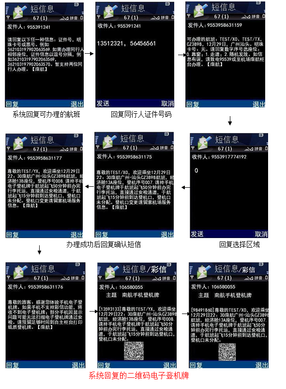 注:在已开通手机电子登机牌业务的机场,可以持手机收到的二维码手机电子登机牌跟有效证件通过安检(广州、武汉、大连)。