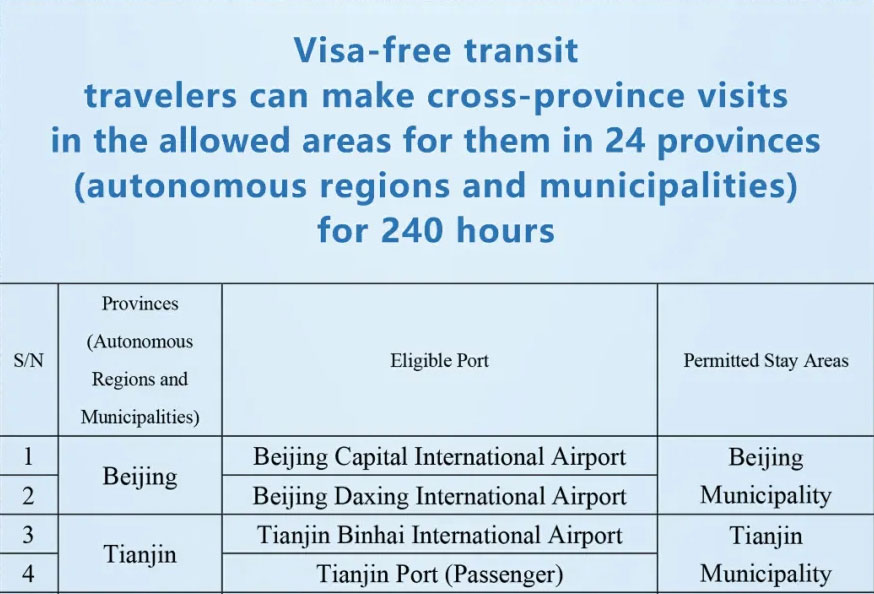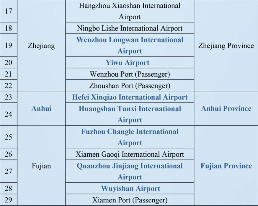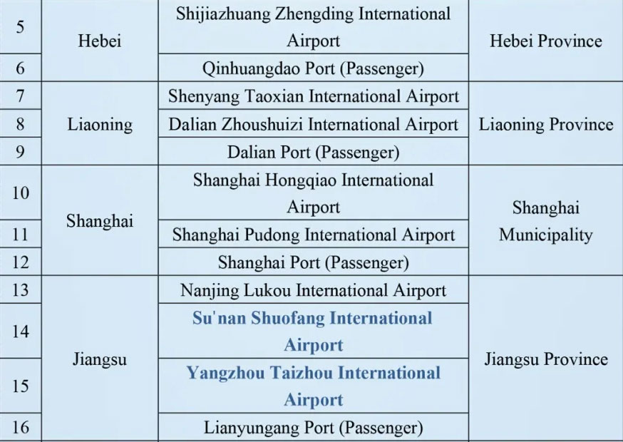 List of Ports and Allowed Areas for Visa-Free Transit Travelers under the 240-Hour Visa-Free Transit Policy Click to view