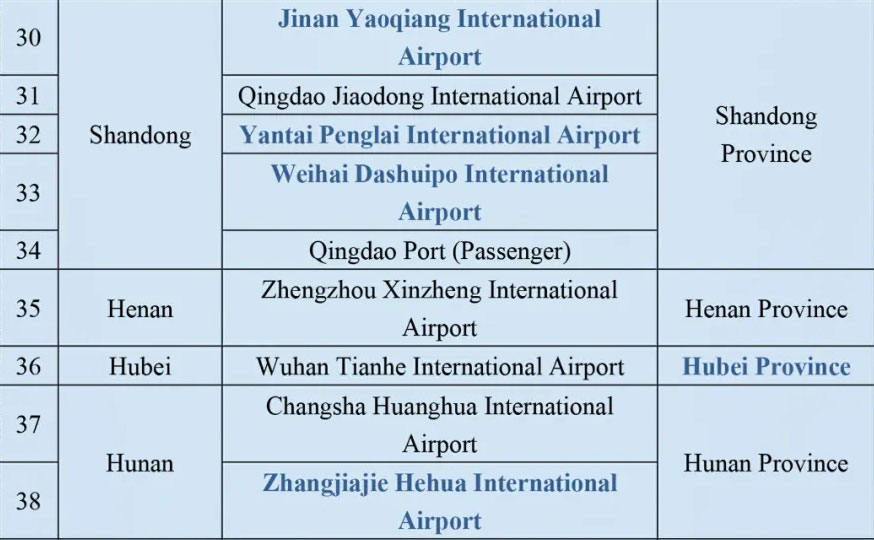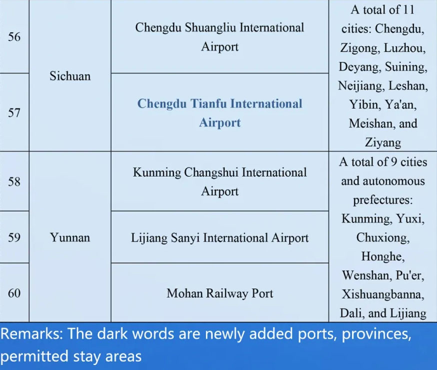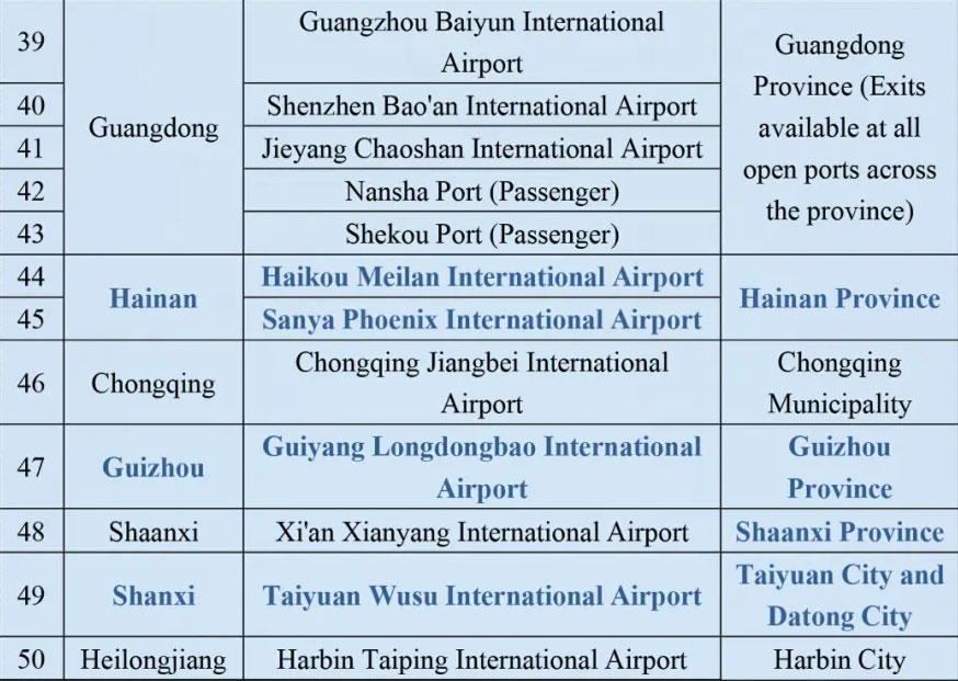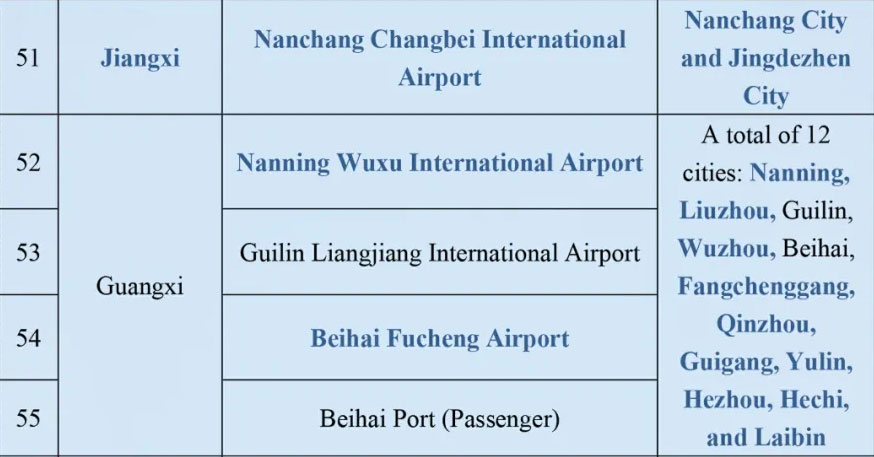 The 21 newly added ports for the visa-free transit policy are Taiyuan Wusu International Airport in Shanxi Province, Su'nan Shuofang International Airport and Yangzhou Taizhou International Airport in Jiangsu Province, Wenzhou Longwan International Airport and Yiwu Airport in Zhejiang Province, Hefei Xinqiao International Airport and Huangshan Tunxi International Airport in Anhui Province, Fuzhou Changle International Airport, Quanzhou Jinjiang International Airport, and Wuyishan Airport in Fujian Province, Nanchang Changbei International Airport in Jiangxi Province, Jinan Yaoqiang International Airport, Yantai Penglai International Airport, and Weihai Dashuipo International Airport in Shandong Province, Zhangjiajie Hehua International Airport in Hunan Province, Nanning Wuxu International Airport and Beihai Fucheng Airport in Guangxi Zhuang Autonomous Region, Haikou Meilan International Airport and Sanya Phoenix International Airport in Hainan Province, Chengdu Tianfu International Airport in Sichuan Province, and Guiyang Longdongbao International Airport in Guizhou Province. The number of opened ports has increased from the original 39 to 60.