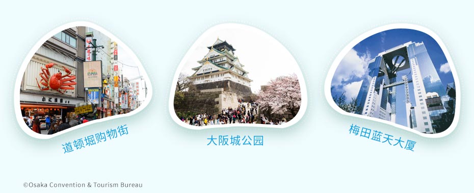 大阪形成日本第二大都市圈,是西日本最大城市。京都、奈良、神户等旅游热门城市从大阪市中心均可在一小时内到达。大阪市内每个地区都有不同的魅力。如世界最大的市商业区“难波”、充满活力的“梅田”,以及人气餐厅林立的“新世界”。大阪还以其章鱼烧、御好烧(大阪烧)、炸串等小吃而闻名。在热闹的“黑门市场”,您可以一边享受购物的乐趣,一边品尝大阪美食。