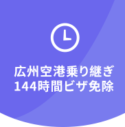 - 広州白雲国際空港では、日本を含む世界54か国の国民が対象の144時間乗り継ぎビザ免除政策の運用が再開されました。条件を満たすお客様は、第三国のビザと144時間以内に第三国(または地域)に向けて出発する日付と座席の確定した乗り継ぎチケットを所持していることを条件に、中国ビザの申請が不要となります。当政策の適用を希望されるお客様は、入国審査官にその旨をお伝えください。144時間の乗り継ぎ時間を使って、広東省内の小旅行や、グルメの都・広州ならではの至福のひと時をお楽しみください!