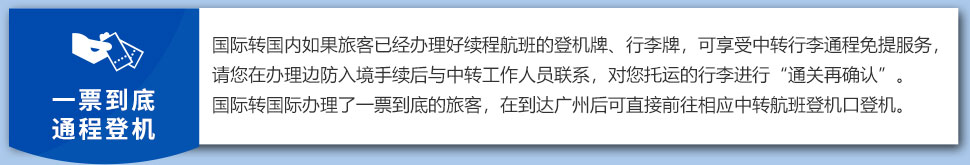 旅客在广州机场可体验丝滑转机服务,中转服务柜台24小时提供旅客服务,可为转机旅客提供咨询和业务办理。