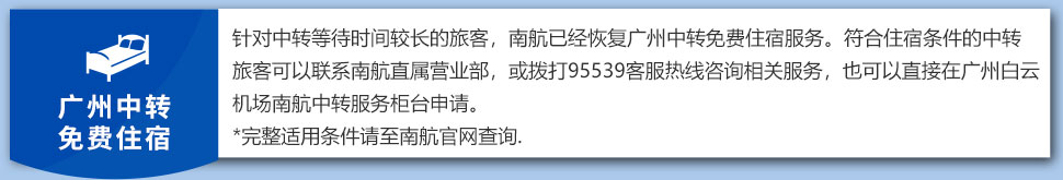 * 中转6小时及以上,南航对符合条件的旅客提供一晚免费中转住宿。可通过南航官网提前预定: