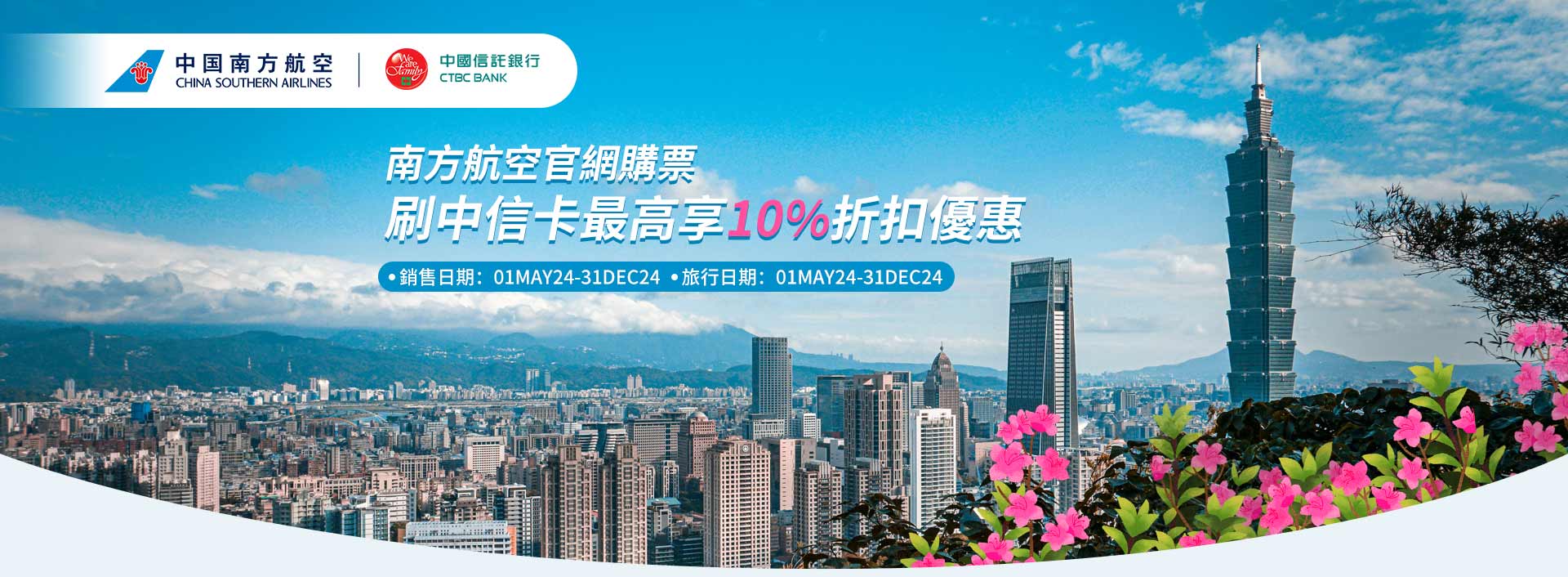 購買南方航空台灣始發機票,可享有購票最高票價10%折扣優惠。