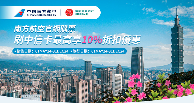 - 4.折扣後票價以中國南方航空台灣官網(https://www.csair.com/tw/tc/)顯示之折扣後金額為準。