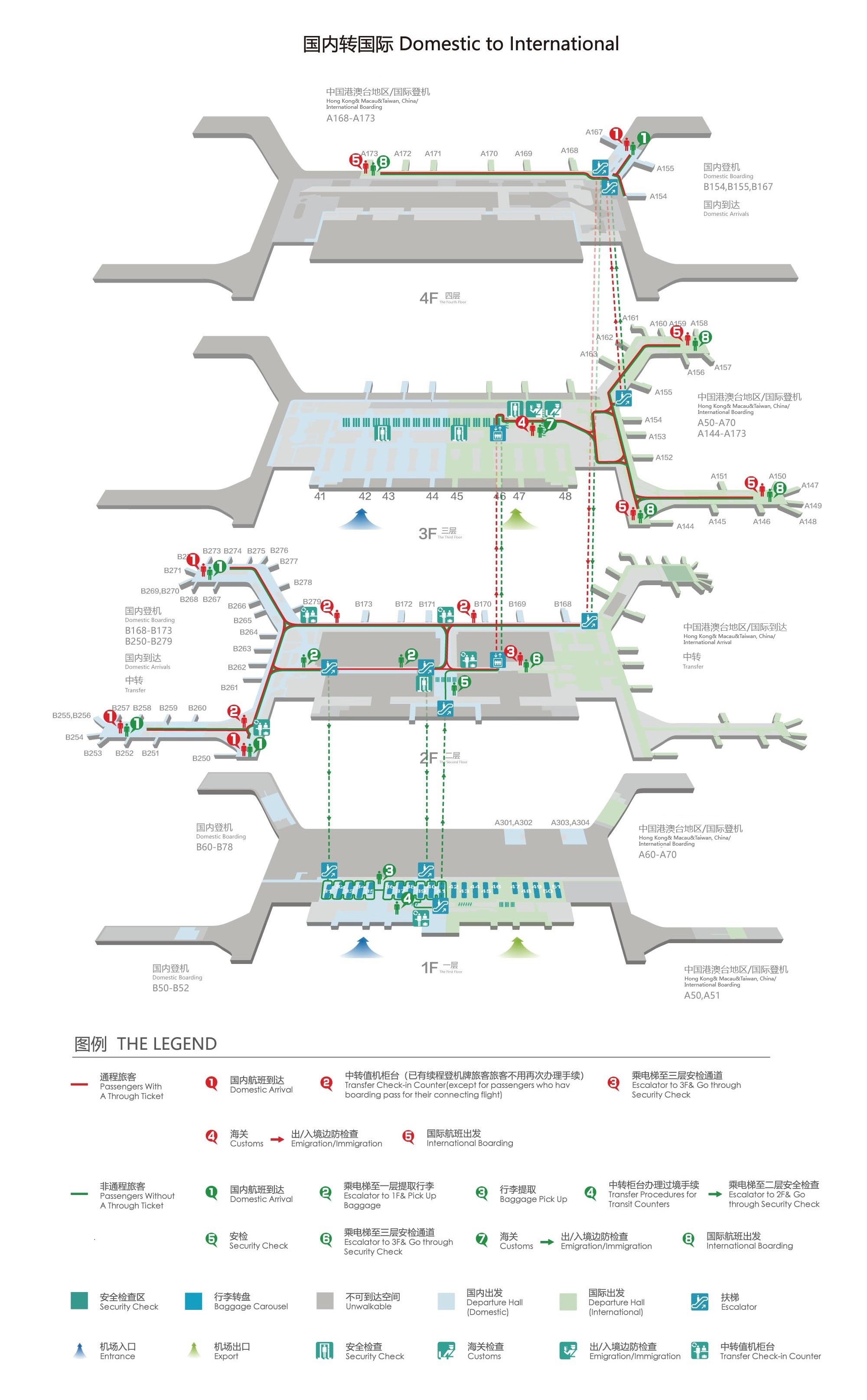 Get off the plane ---> go to the first floor to pick up your baggage from the carousel ---> go through check-in and baggage check-in formalities at the transfer counter on the first floor ---> take the escalator on the first floor to the second floor ---> go through the security check before the cross-shaped corridor ---> go through the cross-shaped corridor on the second floor ---> domestic-international channel--->go through the departure security check channel on the third floor ---> go through customs ---> go through the border exit inspection ---> go to the international departures waiting hall ---> go to the departure boarding gate ---> board the plane. (Passengers who pay for overweight fees need to do this at the check-in counter on the third floor).