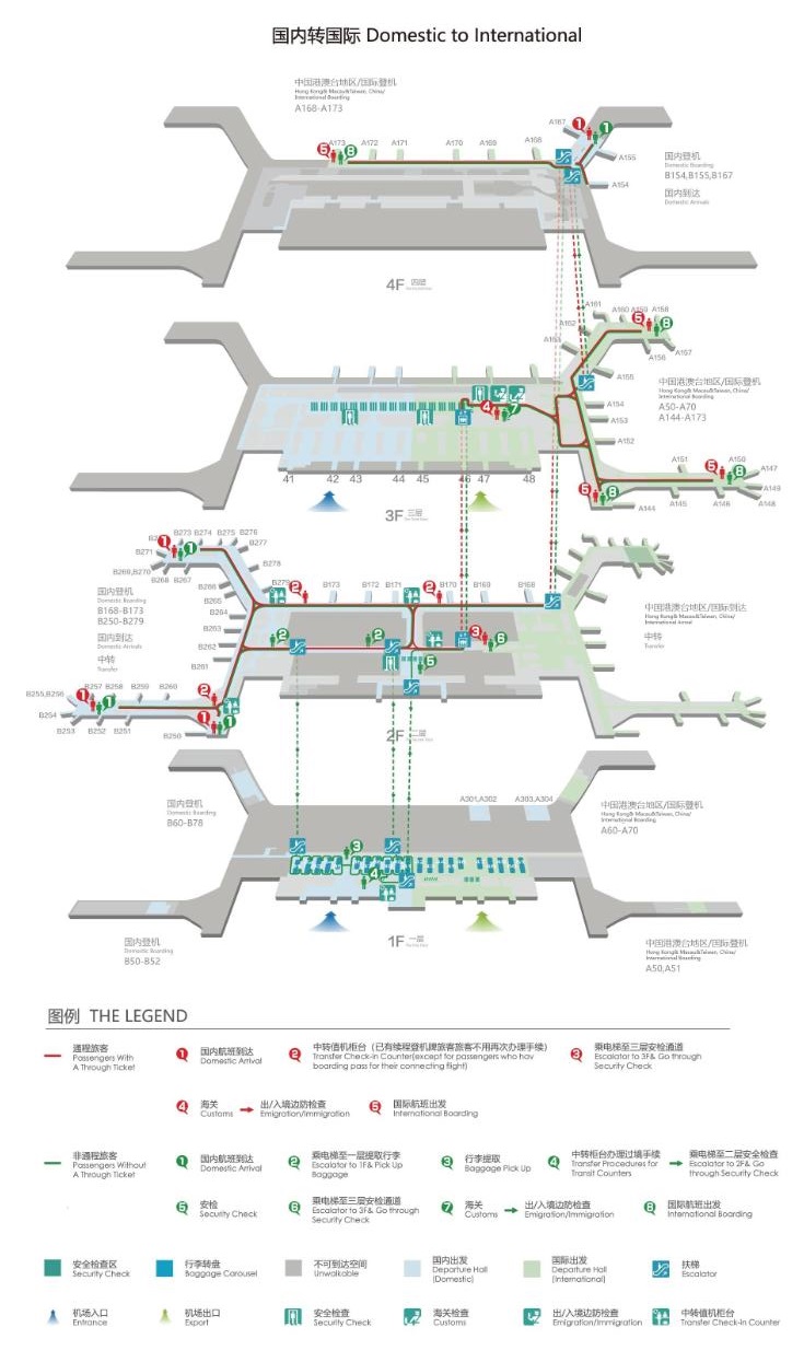 Get off the plane ---> go to the first floor to pick up your baggage from the carousel ---> go through check-in and baggage check-in formalities at the transfer counter on the first floor ---> take the escalator on the first floor to the second floor ---> go through the security check before the cross-shaped corridor ---> go through the cross-shaped corridor on the second floor ---> domestic-international channel--->go through the departure security check channel on the third floor ---> go through customs ---> go through the border exit inspection ---> go to the international departures waiting hall ---> go to the departure boarding gate ---> board the plane. (Passengers who pay for overweight fees need to do this at the check-in counter on the third floor).