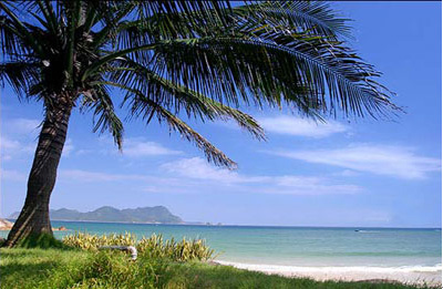 Qing'ao Bay is known as "Oriental Hawaii". The bay is crescent-shaped and the sea surface is plain. The soft and golden sand bay stretches more than 2,400 meters, with a gentle slope, the sands are clean and extended to over 100m on the sea, with no rock or silt; the sea water is pollution-free, and will not change the clear blue color with ebb and flow;