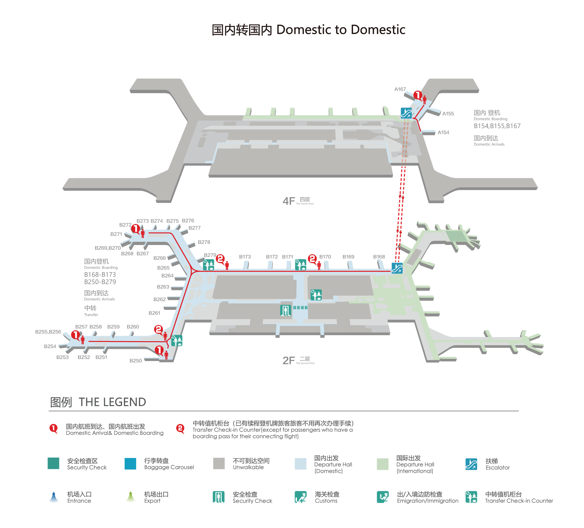 Get off the plane ---> go through transfer formalities at the transfer counter on the second floor (except for passengers who have a boarding pass for connecting flight) ---> (domestic departure and arrival area) go to the departure boarding gate on the same floor ---> board the plane.