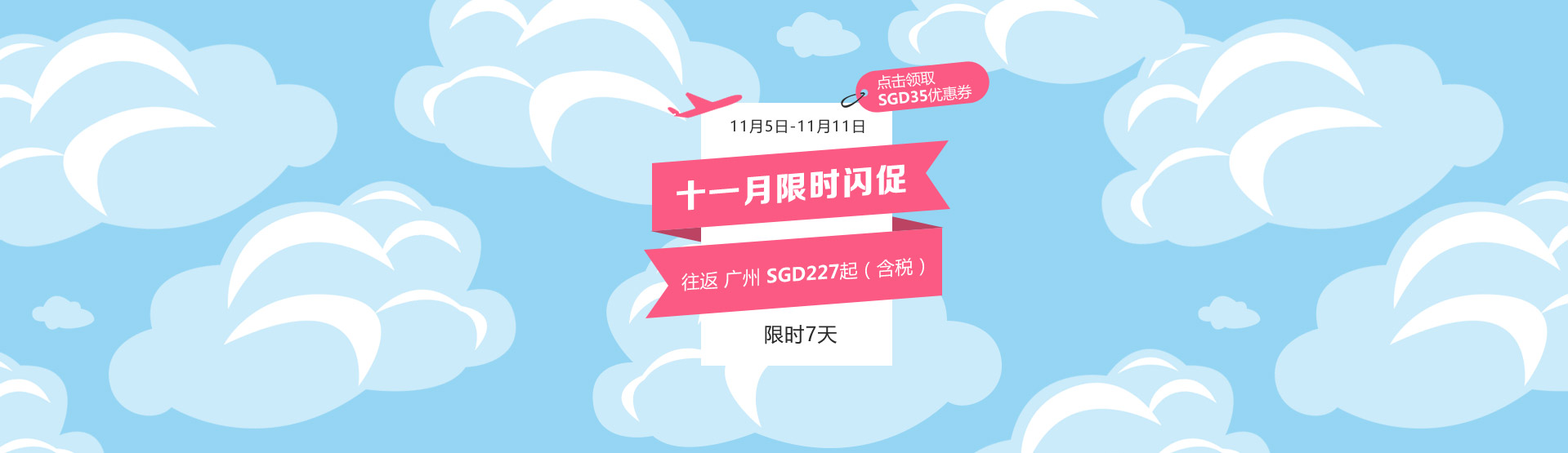6. SGD35国际优惠券仅限购买机票价格(不含税费)在SGD175以上的国际机票。