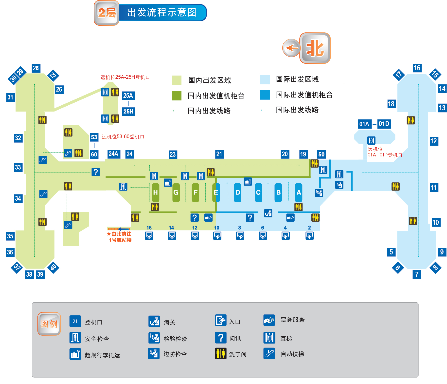 二层:国内、国际出发层。国内航班旅客在该层办理安检手续。国际航班旅客在该层办理海关、检验检疫、边防、安检手续。设有国内两舱休息室、机场餐饮休息区。
