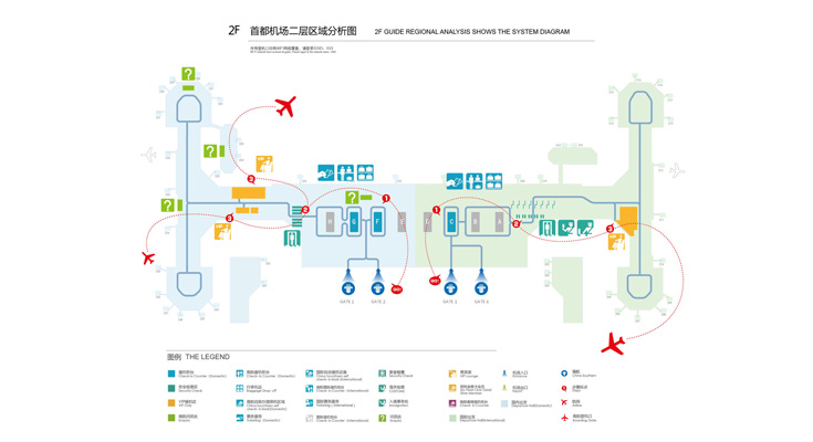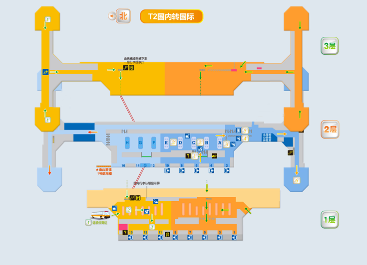 一层:国内、国际到达层。设有国内、国际旅客行李提取大厅,国际到达海关检查,国内-国际交叉中转区,国内远机位出发候机区,机场要客休息室,有连接桥通往交通中心。