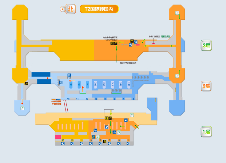 迎接旅客请到T2一层,国际到达出口在右侧,国内到达出口在左侧。同时,一层配备旅客更衣室、取款机、宾馆/酒店咨询等服务设施,为旅客提供更便捷、人性化的地面服务。
