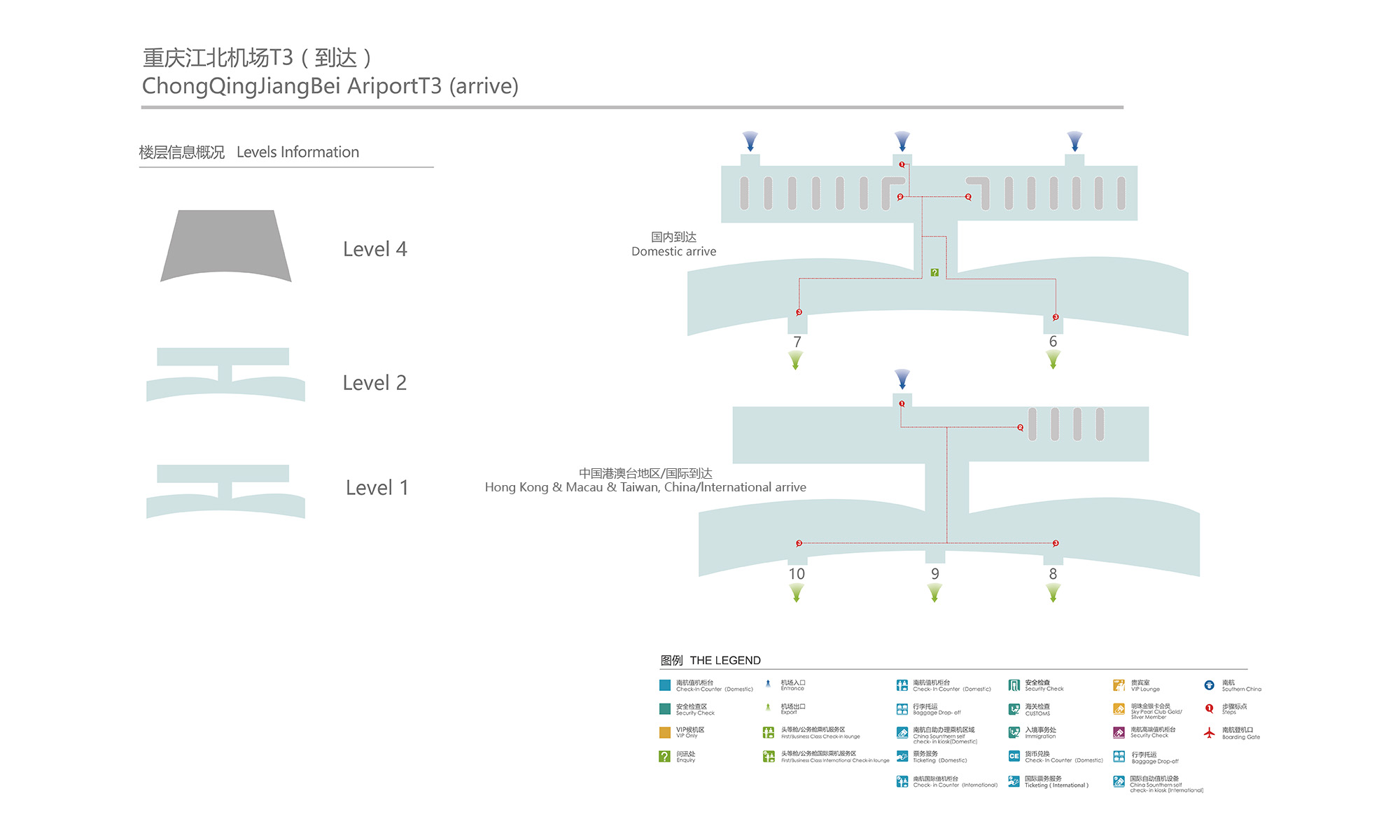 特殊旅客服务柜台176,晚到旅客柜台175,普通值机柜台157-163,高端值机柜台149-155;主任柜台175,超规行李托运柜台位于3H岛后方。