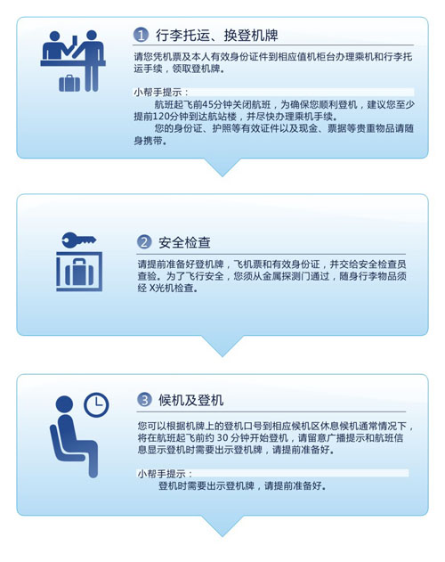 1. 为了您能准时上飞机,请您预留足够的时间到达机场,并办好登机及行李托运手续。在候机厅注意登机广播。