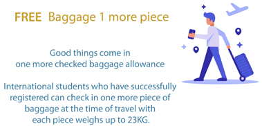 - 8.International students who successfully registered can enjoy free baggage 1 more piece. Thus students who purchase economy or premium economy class tickets can check in 2 pieces of baggage within 23kg each, students who purchase business class can check in 3 pieces of baggage within 32kg each. For passengers who have already enjoyed the extra free checked baggage under China Southern Airlines Sky Pearl Gold and Silver Card, will not be able to enjoy the extra free checked baggage under the international students offer.