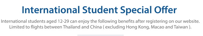 - 6.International student ticket discounts and baggage allowance are only applicable to the flights between Thailand and mainland China (excluding Hong Kong, Macao and Taiwan).