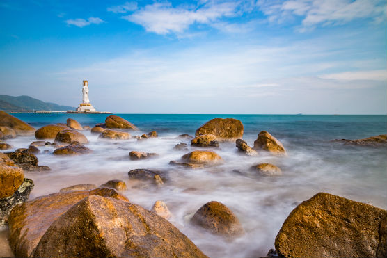 It is a famous easide tourist area in Sanya City. Legend has it that a couple can be together lifetime if they come here. The scenic spot is located 24 kilometers west of Sanya. The Sun and Moon Stone is located on the sea surface at the entrance of the scenic area. The stone is composed of two cross-tapered rocks engraved with "Sun" and "Moon" respectively and dependent on each other. Legend has it that couples come here can love each other and become old together, hence famous.