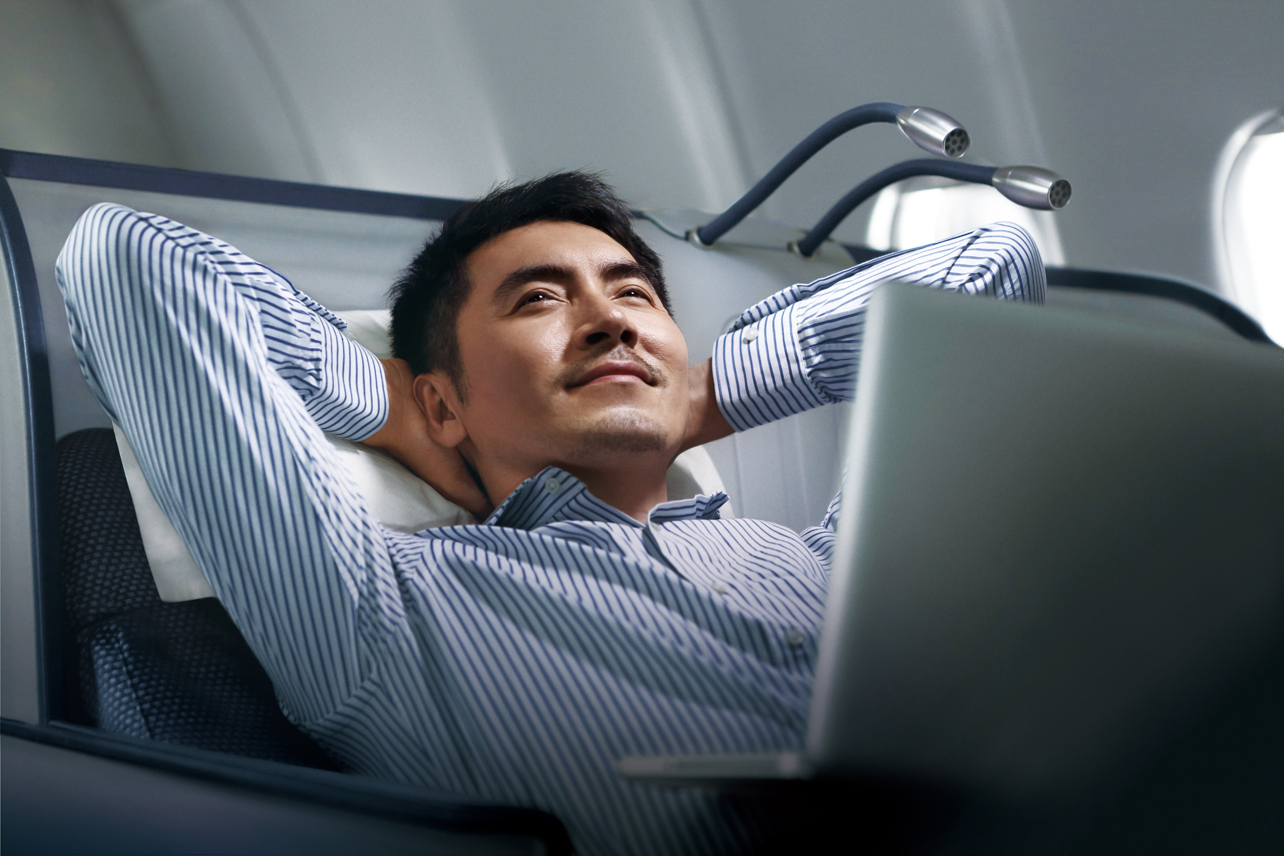 Lay down the deluxe and comfortable seat into a bed at a touch of a button,resting around the cozy surroundings with exceptional comfort and enhanced privacy.The large-screen personal TV brings cinematic experience to unwind yourself.Make a warm and sweet dream like a soundly-sleeping baby during the journey with the earphones we serve you.