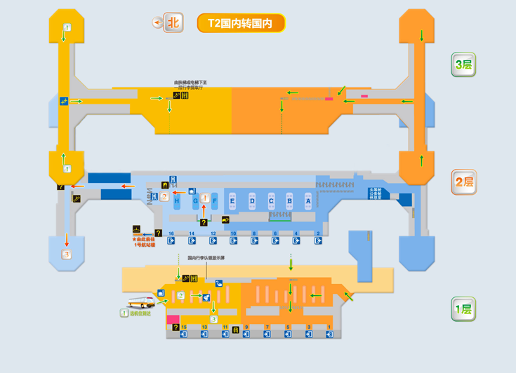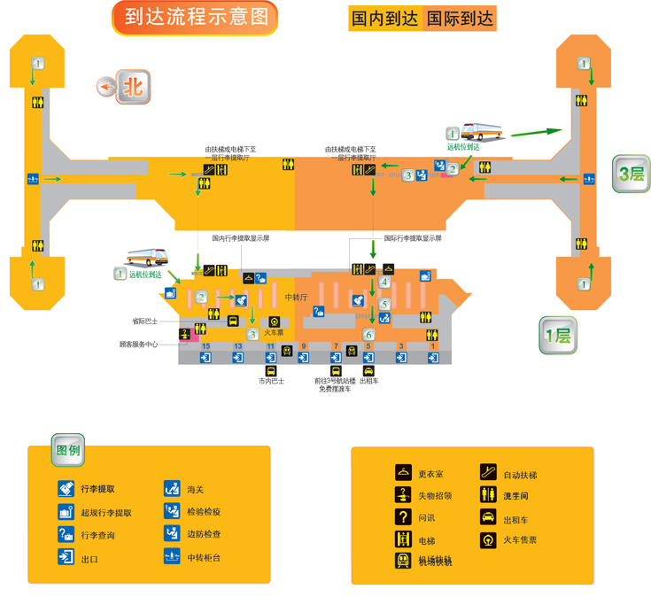 一層:國內、國際到達層。設有國內、國際旅客行李提取大廳,國際到達海關檢查,國內-國際交叉中轉區,國內遠機位出發候機區,機場要客休息室,有連接橋通往交通中心。