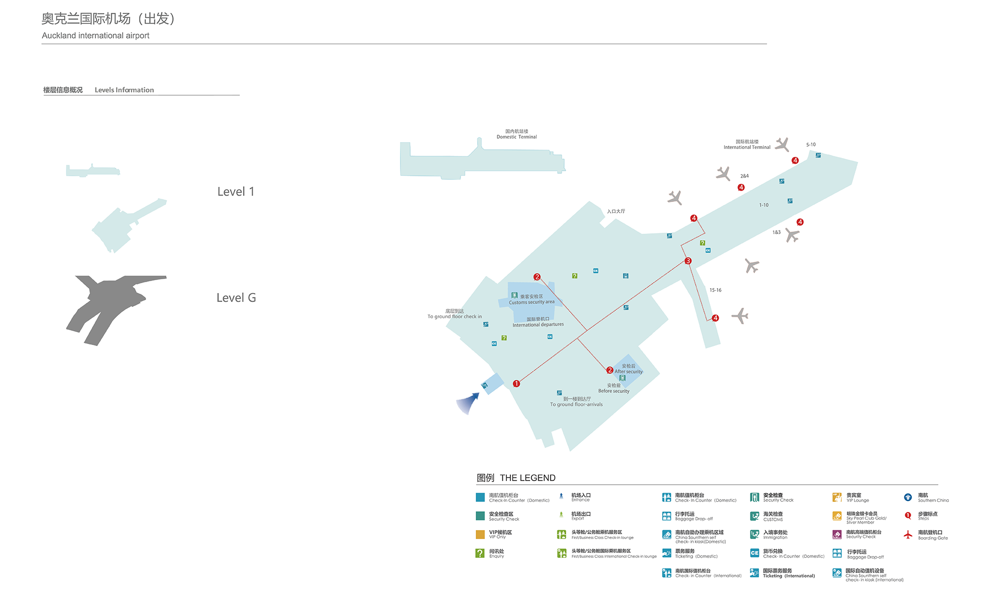 飛機停靠登機橋,旅客下機通過廊橋到達第一層迎客大廳--->步行或乘坐機場免費巴士到達國際候機室(線路或乘車地點如圖) --->到國際候機室一層辦理登機牌--->二樓通過紐西蘭海關 --->通過安檢--->通過扶梯或電梯下一層至國際出發候機廳--->登機。